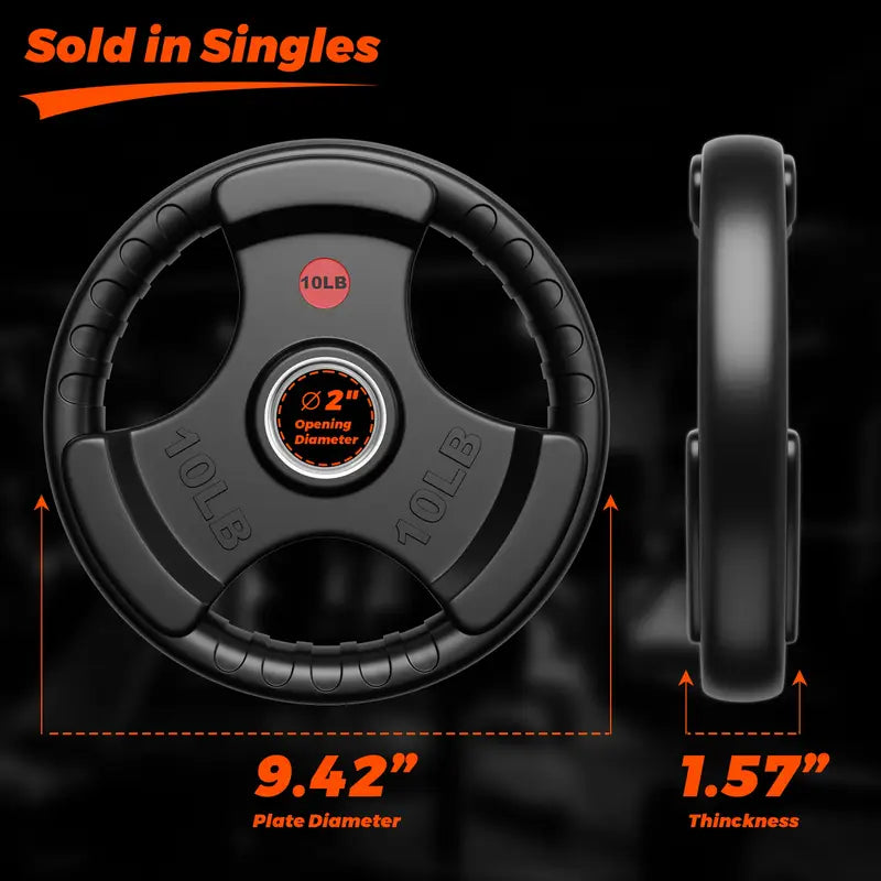 10LB ergonomic rubber grip weight plate, designed for secure handling and effective strength training. The solid iron core ensures durability, while the non-slip rubber surface provides a firm grip for safe lifting. Compatible with all 2-inch Olympic barbells, this plate is perfect for home or gym use.