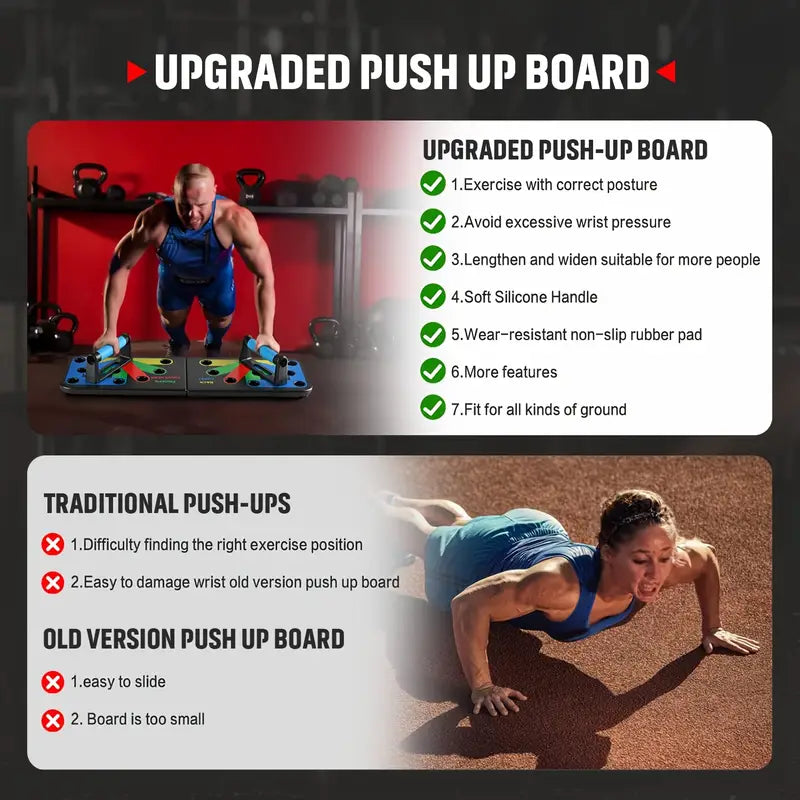 Foldable push-up board designed for targeted muscle training. Features color-coded positions to guide hand placement for back, chest, shoulders, and triceps. Compact and lightweight for easy storage and home use.