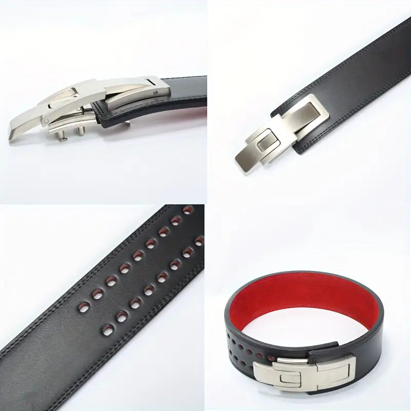 Weightlifting belt designed to provide support during heavy lifts such as squats and deadlifts. Features a secure metal buckle and reinforced construction for stability and core engagement during workouts.