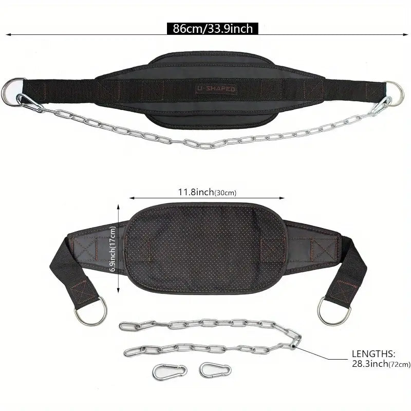 Enhance your strength training with this heavy-duty dip belt designed for weighted pull-ups, dips, and other resistance exercises. The padded back support ensures comfort during intense sessions, while the durable chain and hook-and-loop closure provide secure weight attachment.